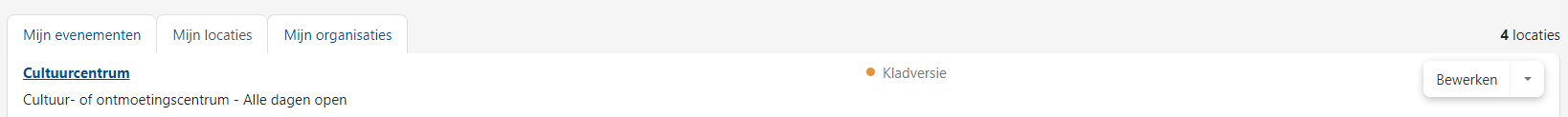 Niet alle locaties zijn gepubliceerd op UiTinVlaanderen. Voerde je een nieuwe locatie in tijdens het aanmaken van een evenement? Dan zal deze als een kladversie bewaard worden.